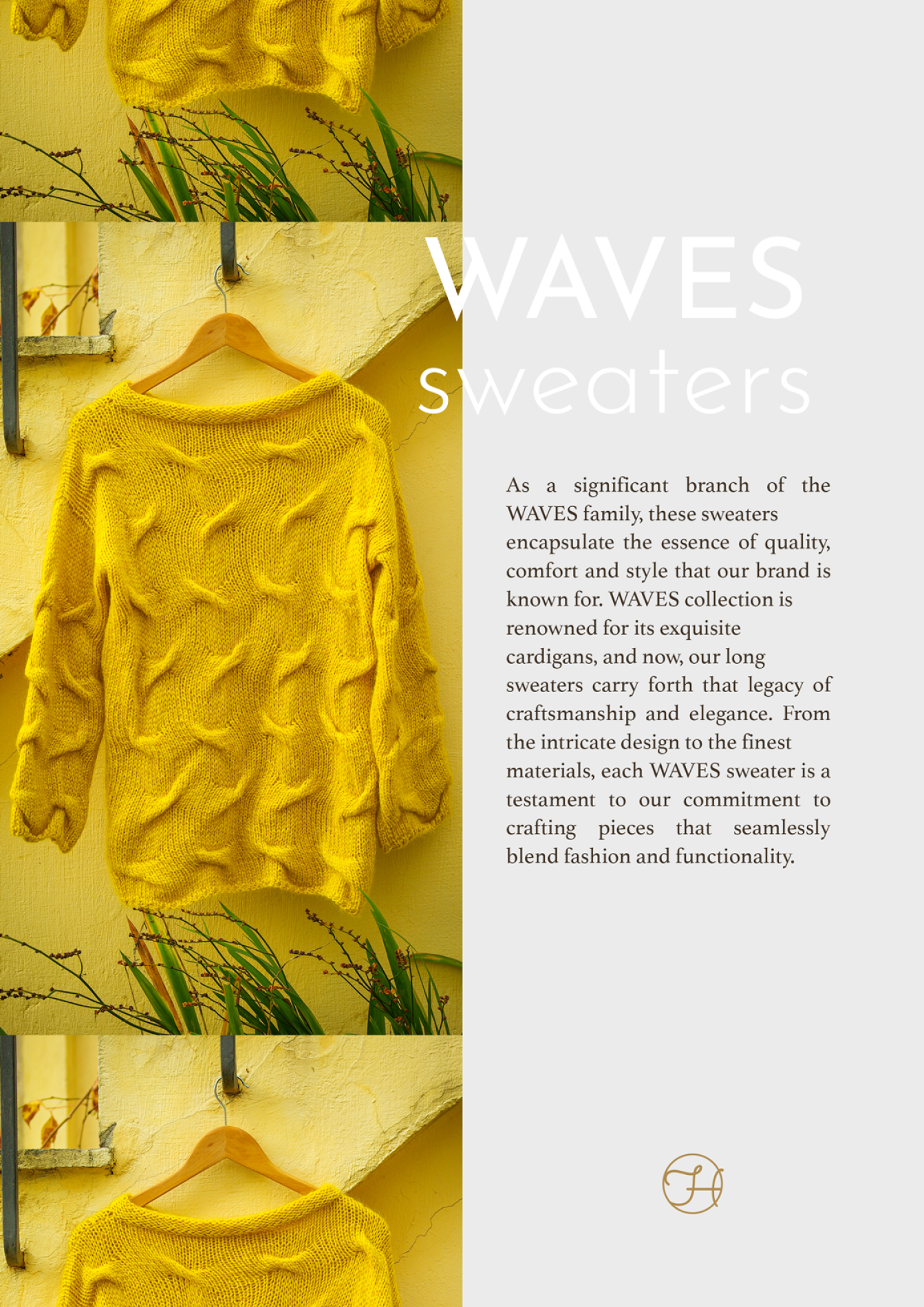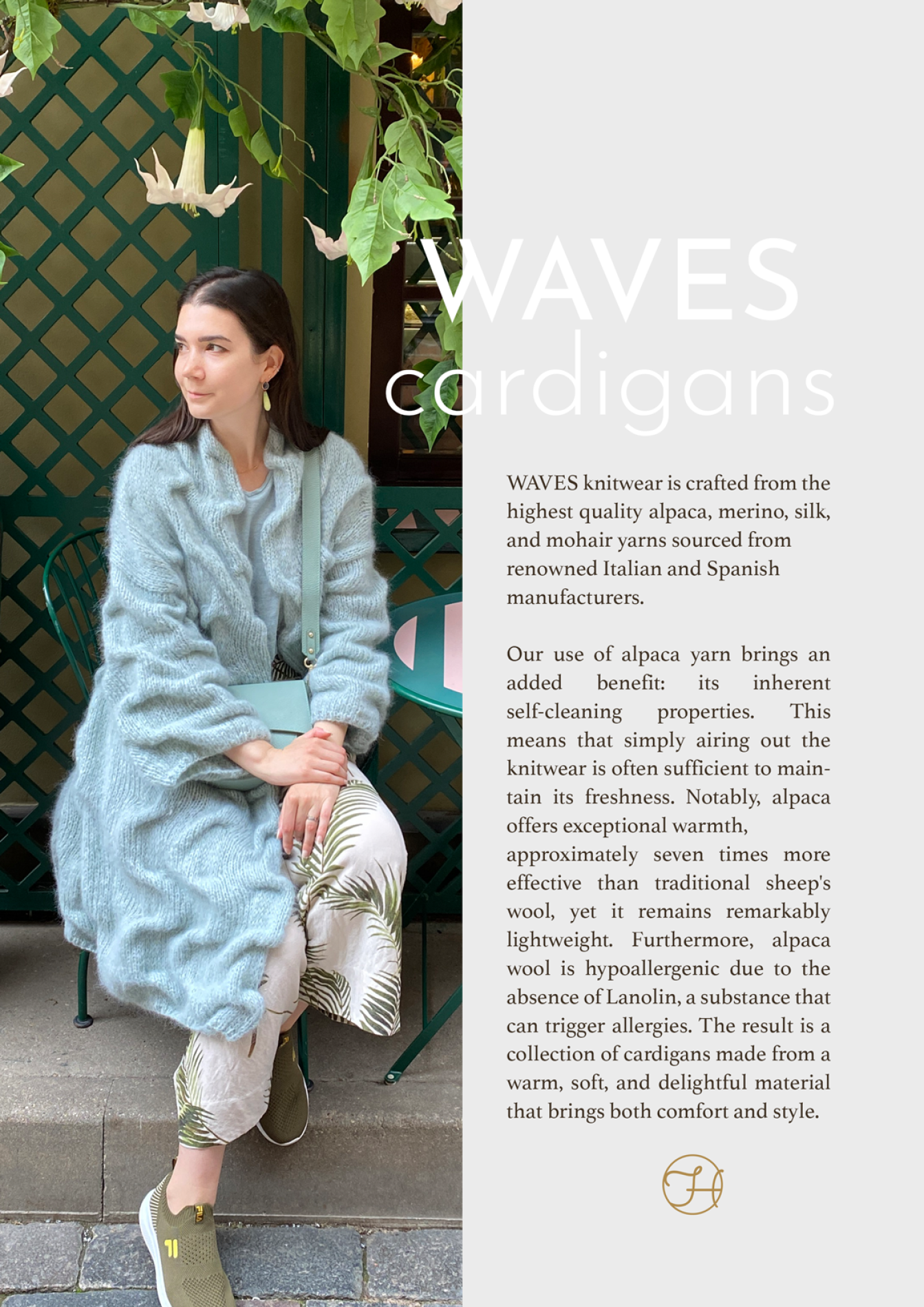 Every WAVES piece of knitwear is unique and has a name. The price of each item depends on the type of the yarns used and the weight of the finished knit.
